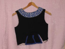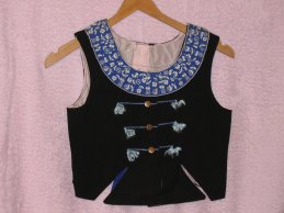 In Kattowitz-Brynow (s. Bild) wurde das Mieder blau verziert: die Borte am Ausschnitt, die Stickerei in Kett-Stich, die Fransen und die Borte um die rückwärtigen Klappen war blau. In Kattowitz-Myslowitz hingegen war die Verzierung grün!