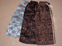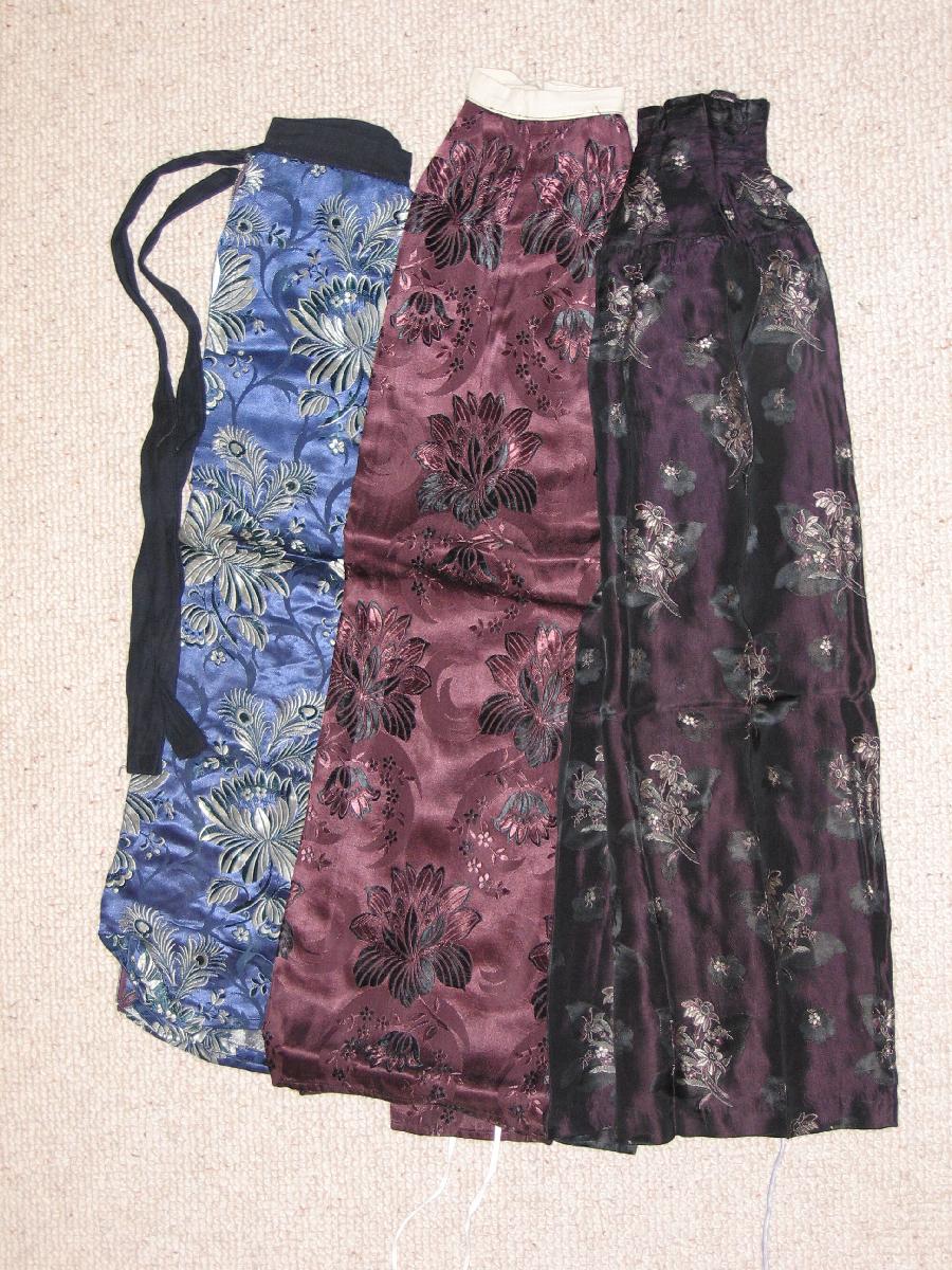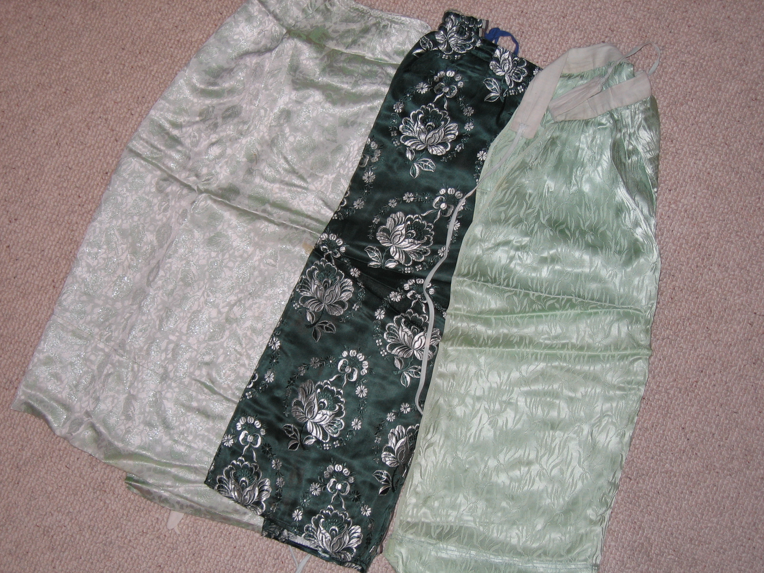 Die Schürzen waren aus bunter, in sich gemusterter Seide. Zusätzlich zu einer Schleife an der Taille wurde ein Gürtel aus ("Indianer"-)Perlen, silbernen oder goldenen Ketten getragen. Die Ketten hingen in Bögen herunter und auch ihre Anzahl wurde an Festtagen ergänzt, wenn die Familie sich dies leisten konnte.